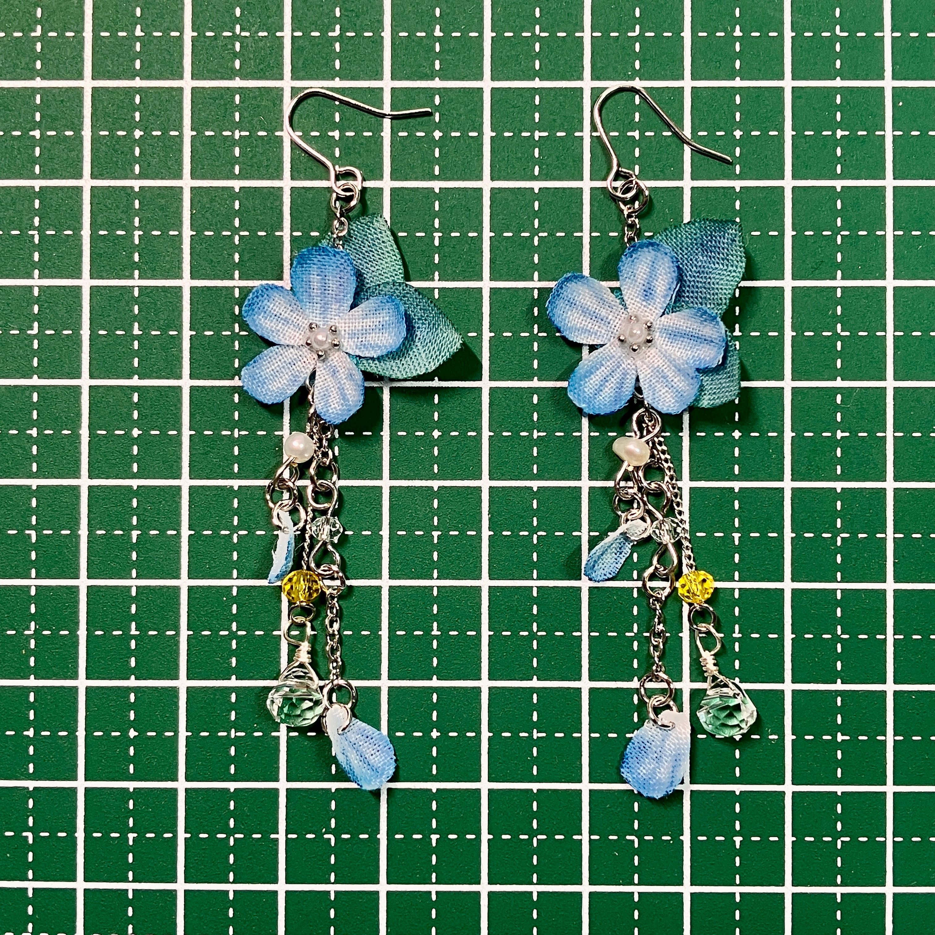 可愛らしい「チェーン揺れる青い花のピアス(イヤリング)」が登場!シンプルな花のデザインが耳元で優しく揺れ、見る人を魅了します。動きを持たせるためにチェーンを下げ、ガラスビーズや花びらがアクセントとして華やかさを添えています。布で作られた軽やかなこのアクセサリーは、普段使いから特別なシーンまで幅広くお楽しみいただけます。心地よい着け心地で、あなたのスタイルに可愛らしさをプラスします。