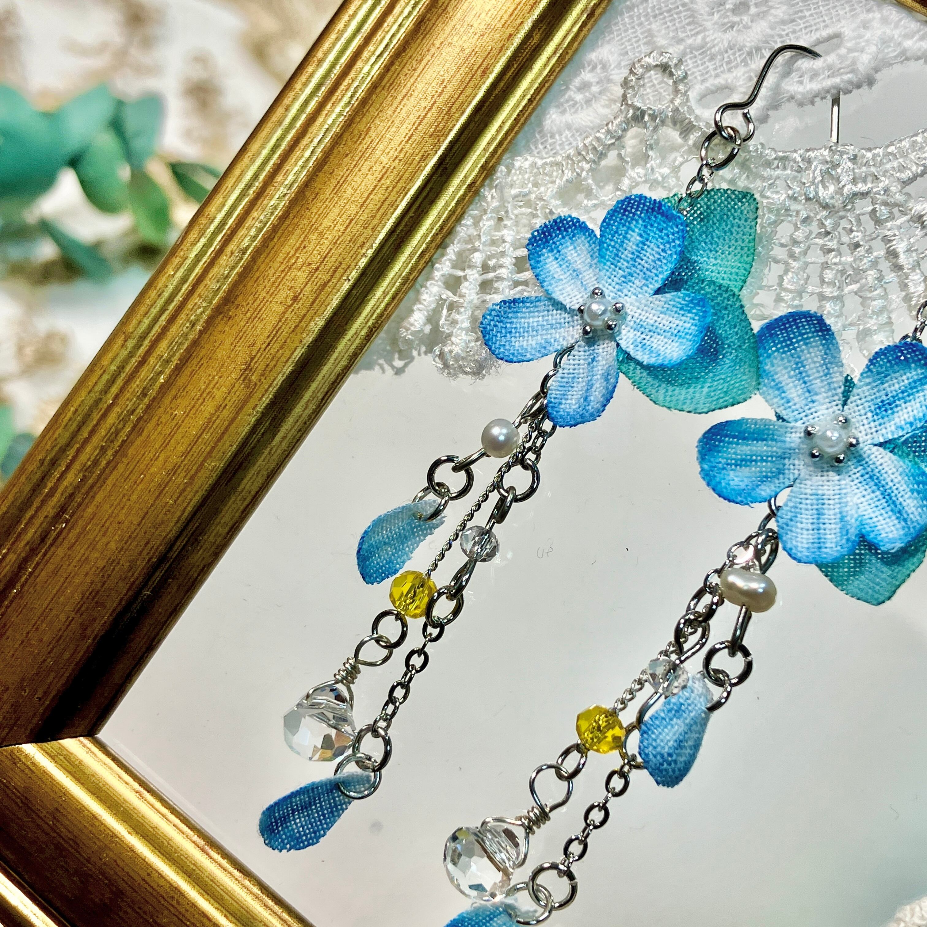 心和むチェーン揺れる青い花のピアス(イヤリング)