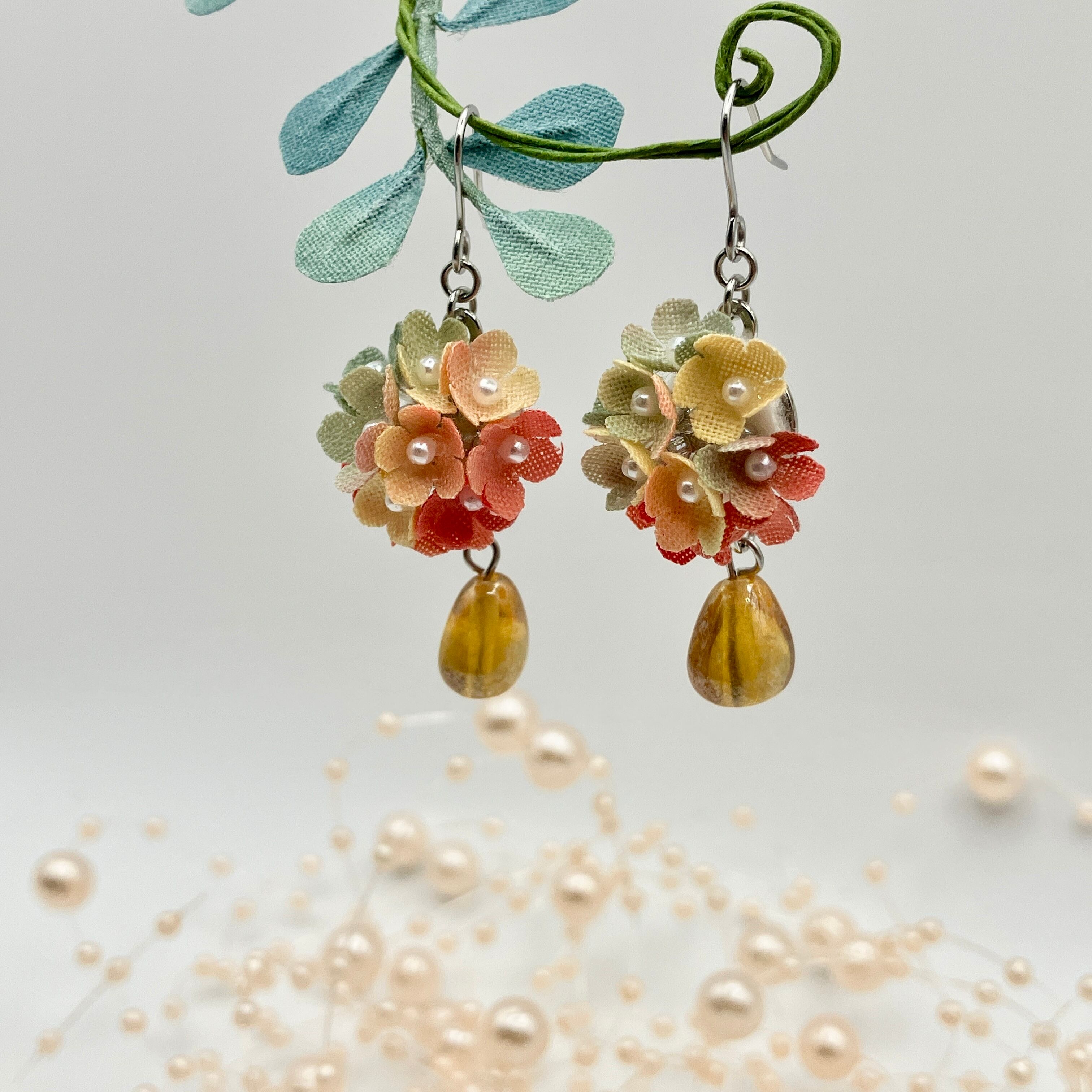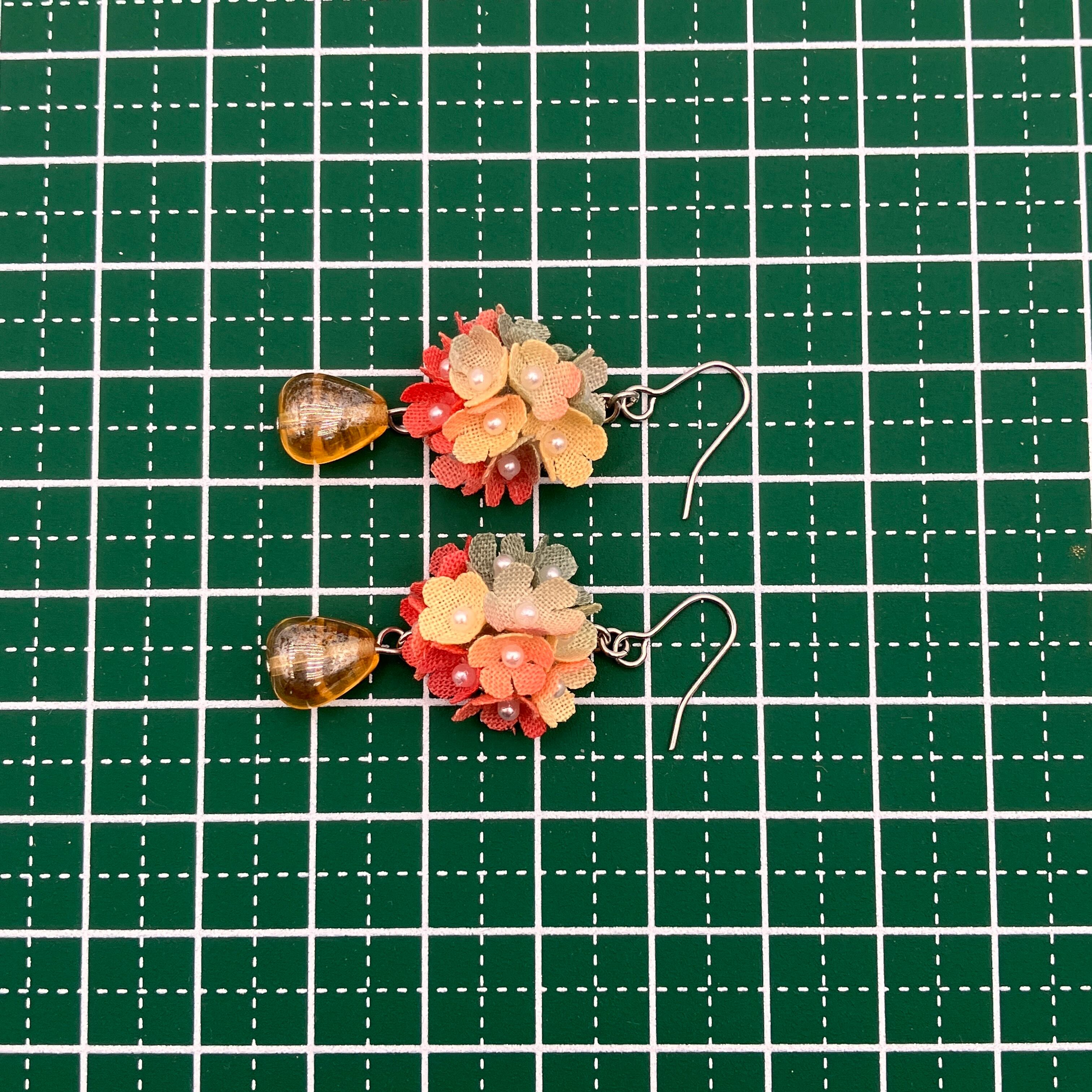 新たに登場した「りんご風リトルフラワーとチェコビーズのピアス(イヤリング)」は、可愛らしいりんごをイメージした花々が特徴です。小さな花が集まったリトルフラワーは、愛らしさを引き立て、耳元で優しく輝きます。大きめのチェコビーズをアクセントにあしらったこの布製の軽やかなアクセサリーは、日常のコーディネートから特別なシーンまで、さまざまなスタイルに寄り添います。快適な着け心地で、あなたをより一層魅力的に引き立てます♪
