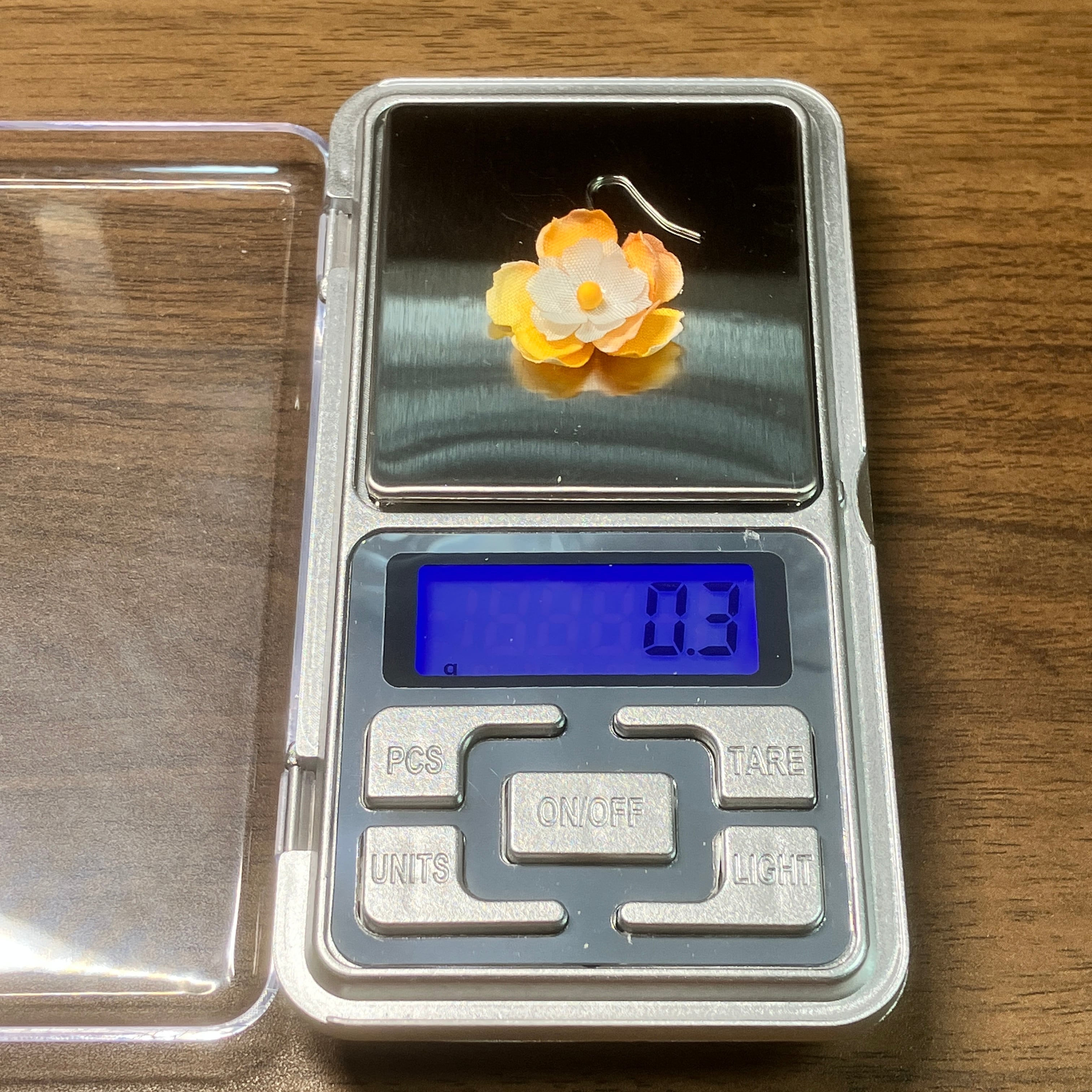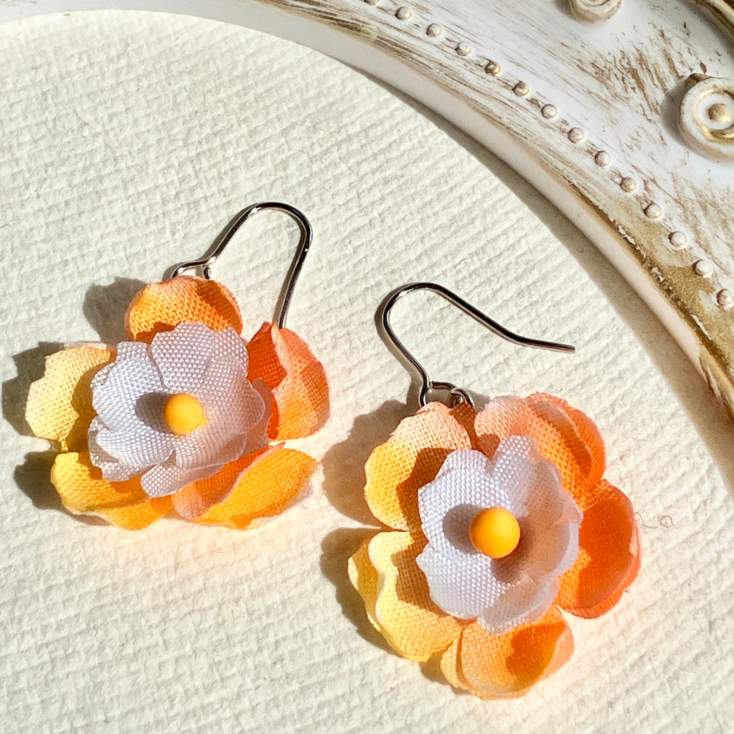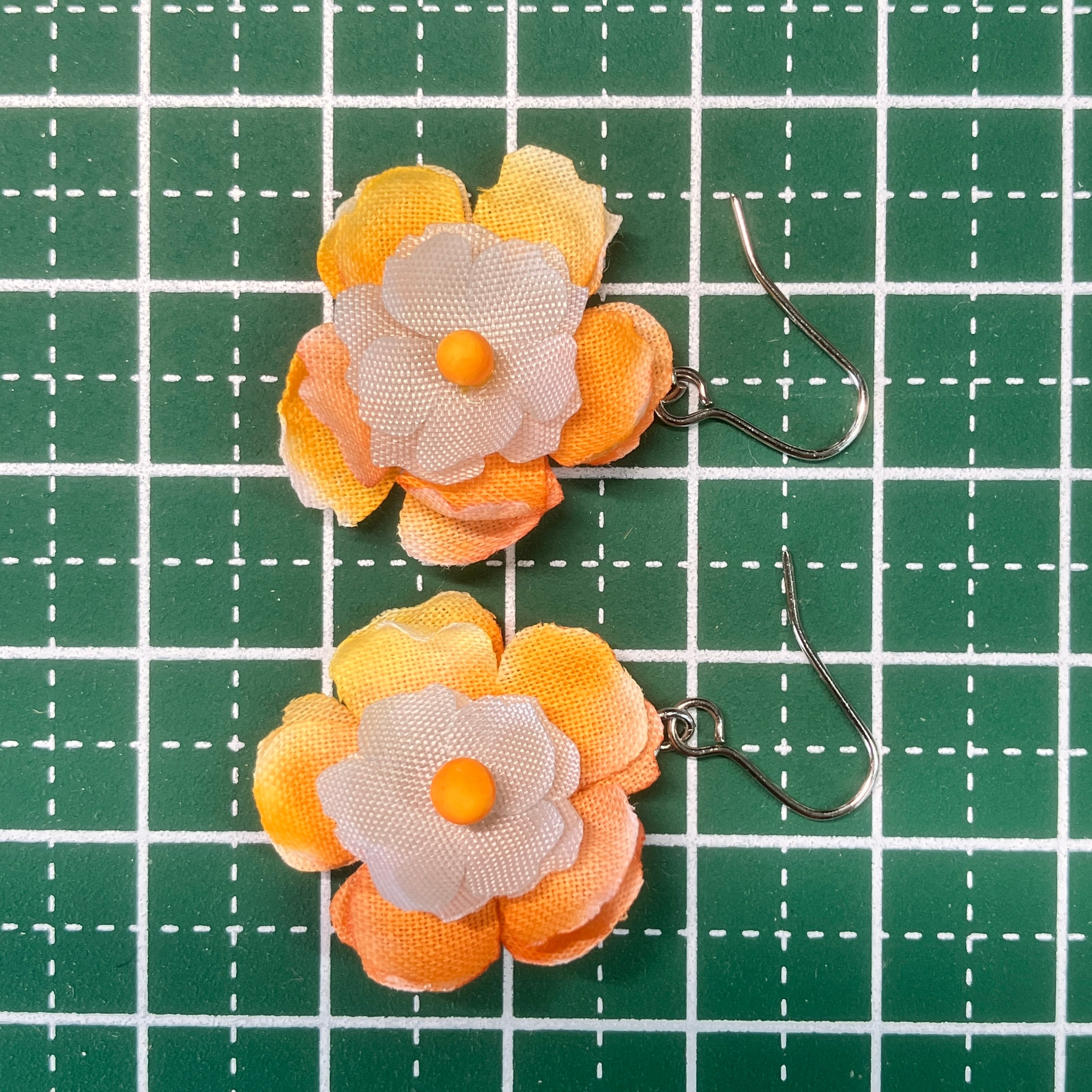 お花ピアスの橙色です。布で作られた軽やかな着け心地のどこかレトロな雰囲気もあるポップなアクセサリーです。